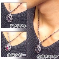 立体的で繊細な唐草模様がダイヤ型にデザインされ、その周りを楕円型に囲んだペンダントトップです。裏面には同じく繊細なデザインが施された真鍮製の透かしデザインがはめ込まれています。中央の石は、合成サファイア・アメジスト・合成ルビーの3種類からお選びいただけます。